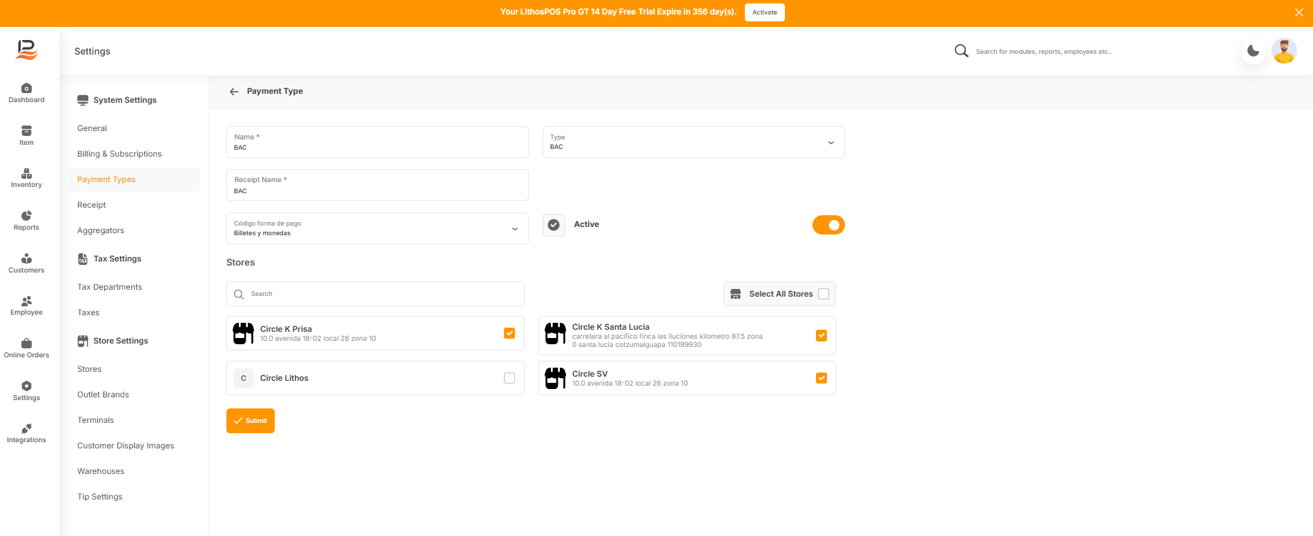 LithosPOS supports integrated in-store payments through BAC Credomatic, a leading payment solutions provider in Central America, including Guatemala. This integration allows merchants to process debit and credit card transactions directly from the LithosPOS POS interface using a BAC payment terminal. BAC integration streamlines checkout by automatically sending the payable amount from LithosPOS to the BAC terminal, reducing manual entry errors and speeding up transactions.