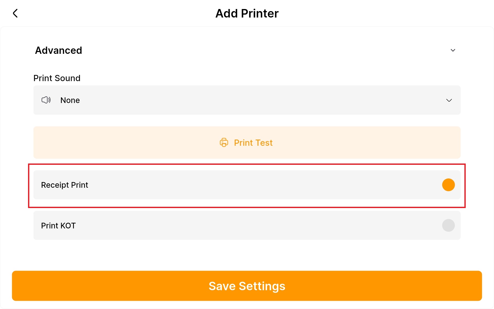 - Under Store Settings, enable KOT to allow kitchen order tickets to be printed.